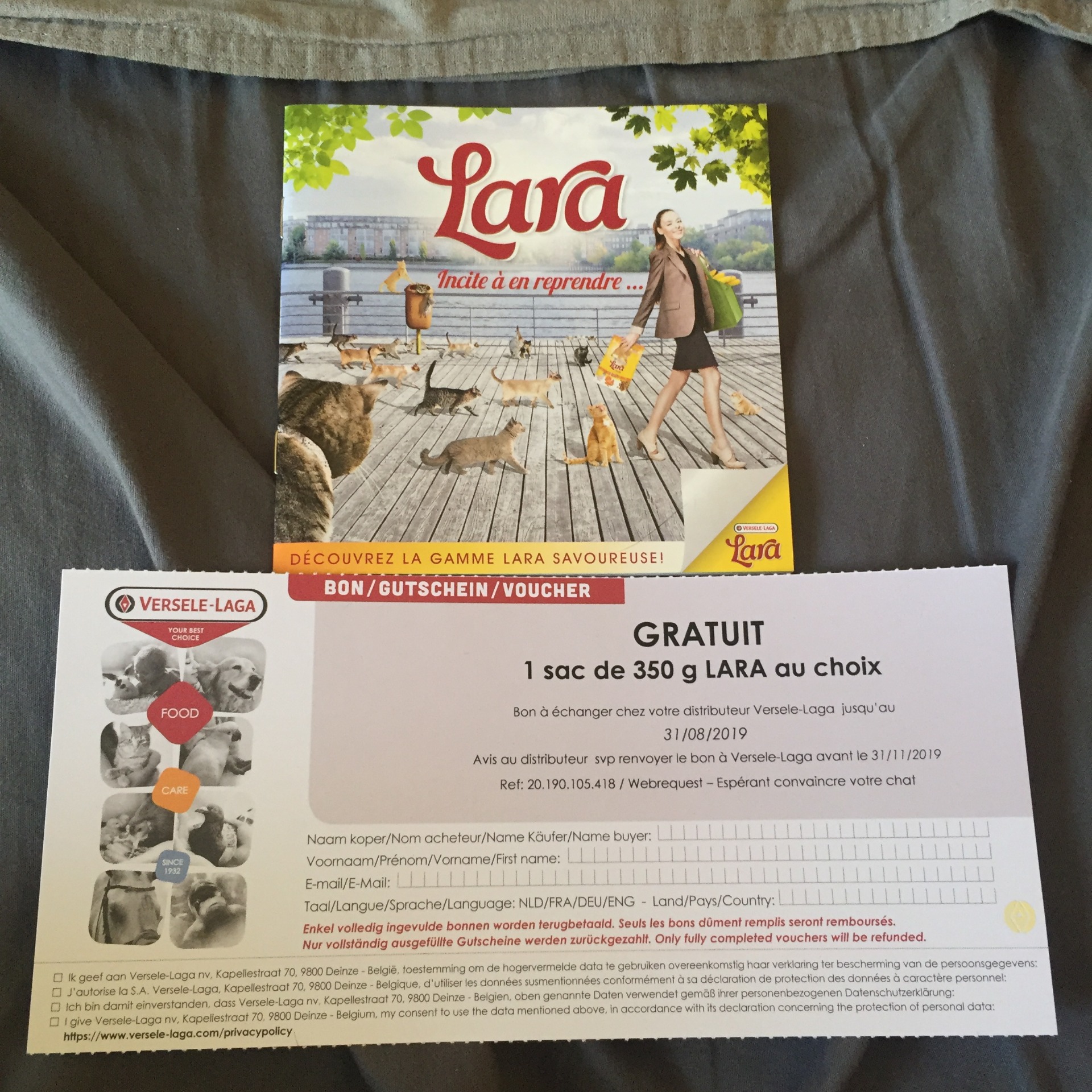 J'ai été gâtée aujourd'hui : j'ai reçu un bon pour retirer un échantillon de croquettes LARA, un stylo de la ville de Narbonne, des cartes "Because I said I would" et une brochure accompagnée d'un poster Puy du Fou.